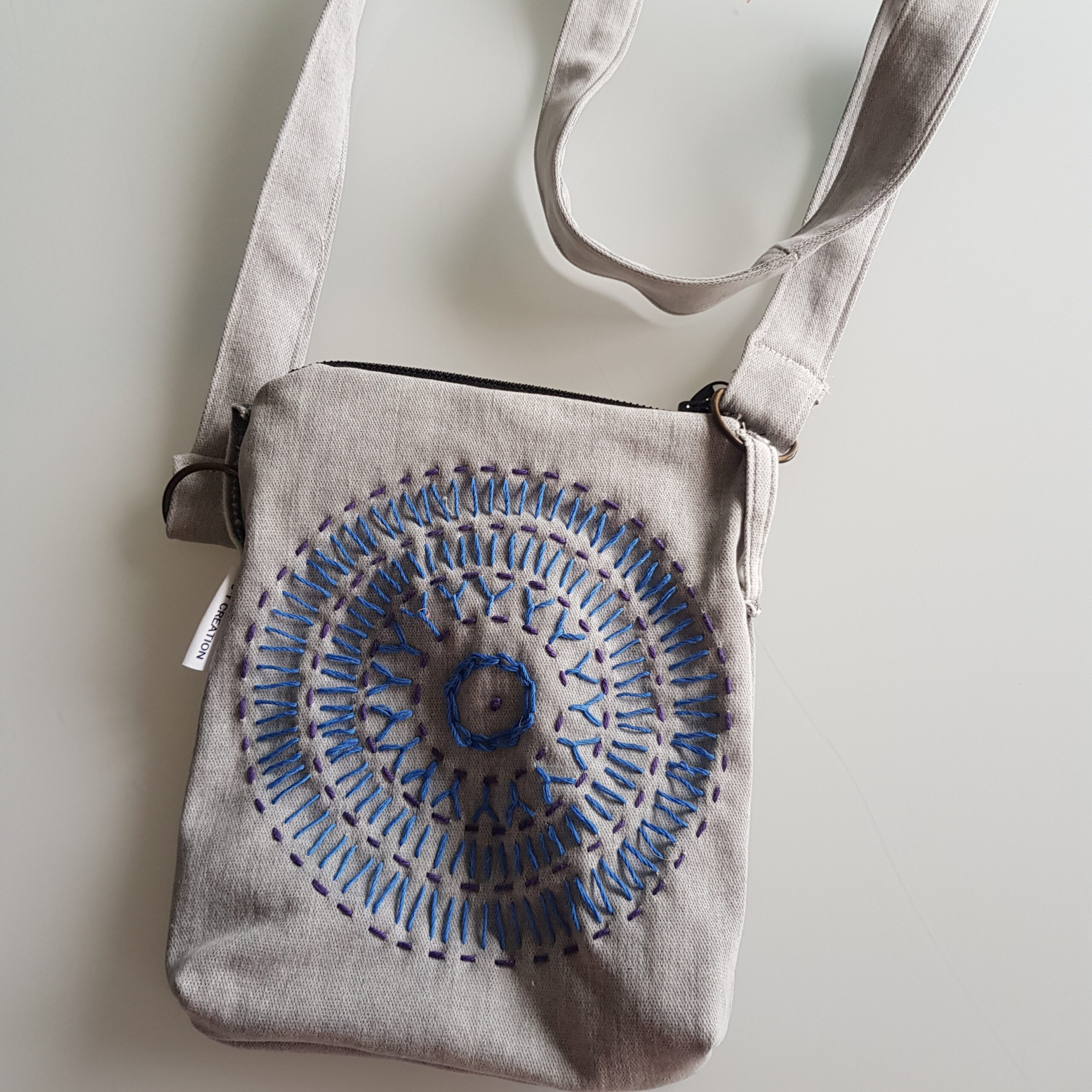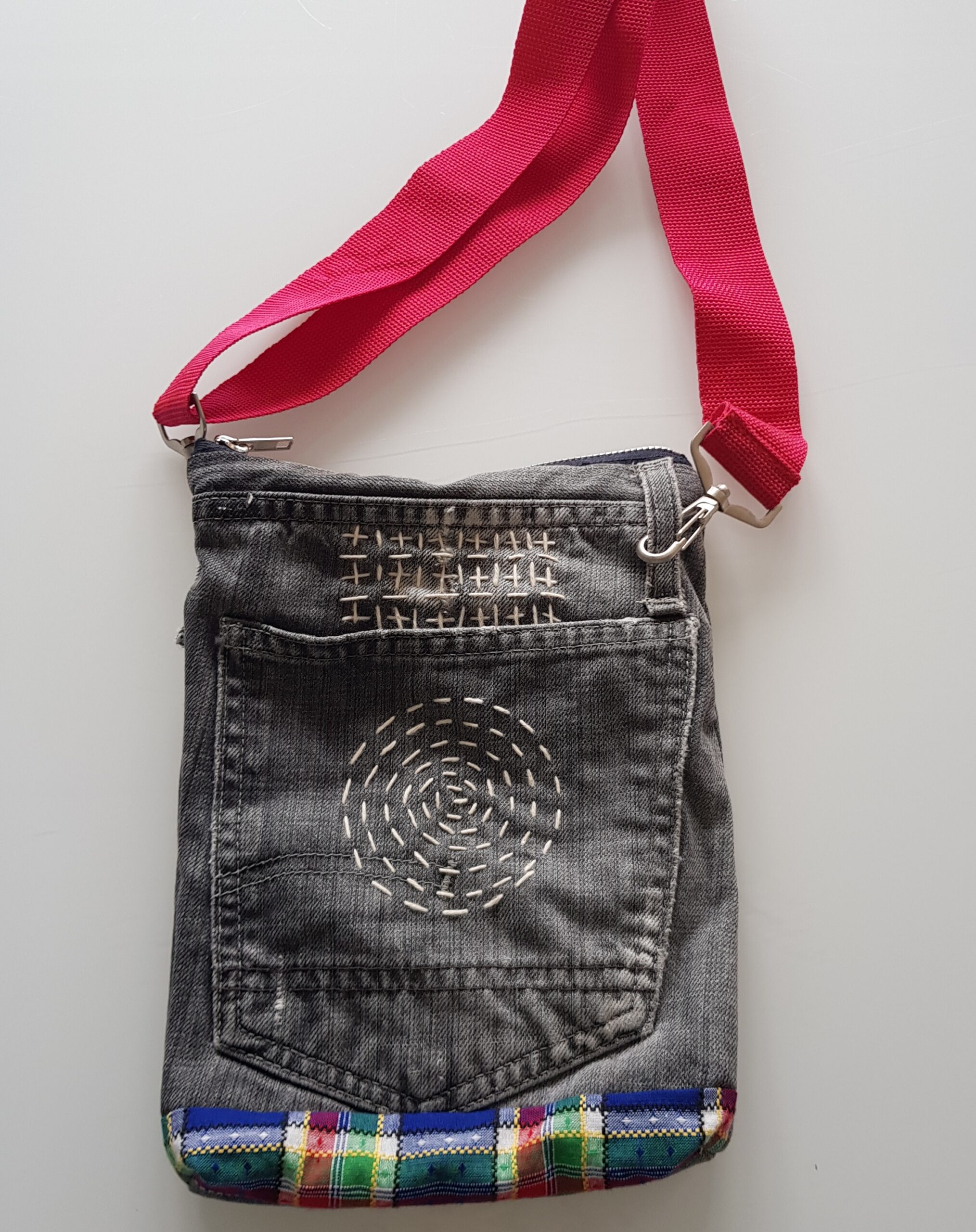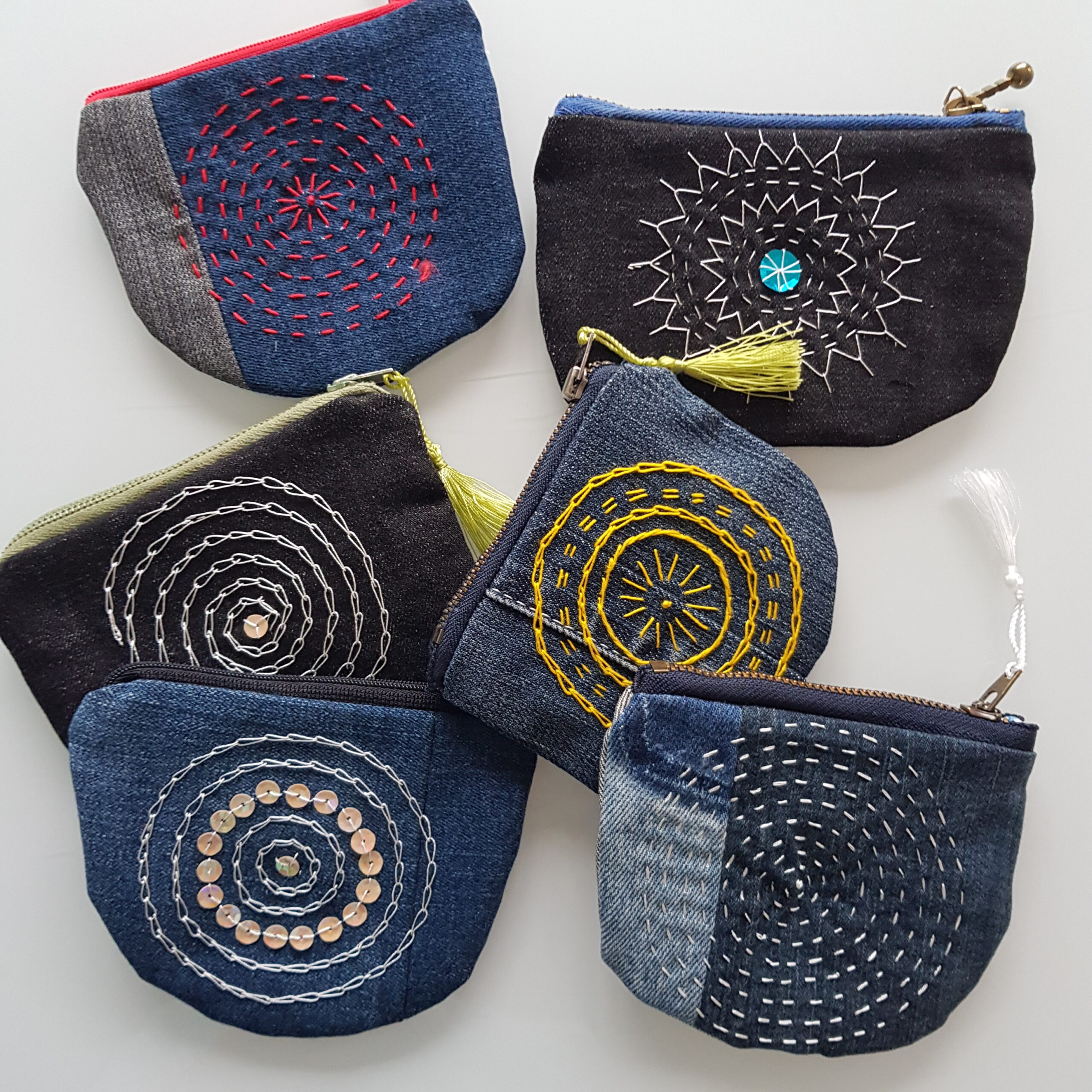 Beursjes gemaakt van oude spijkerbroeken en hand geborduurd.