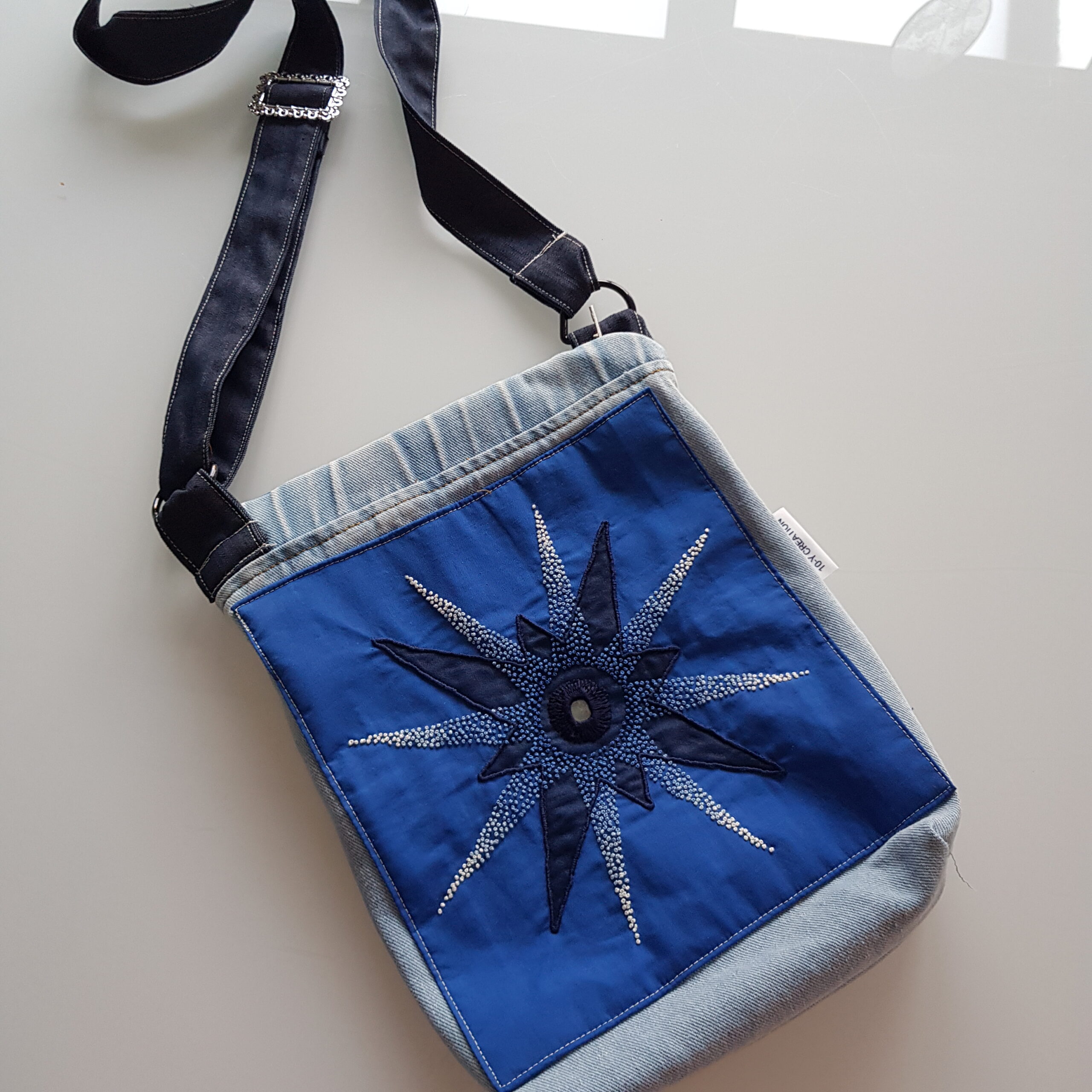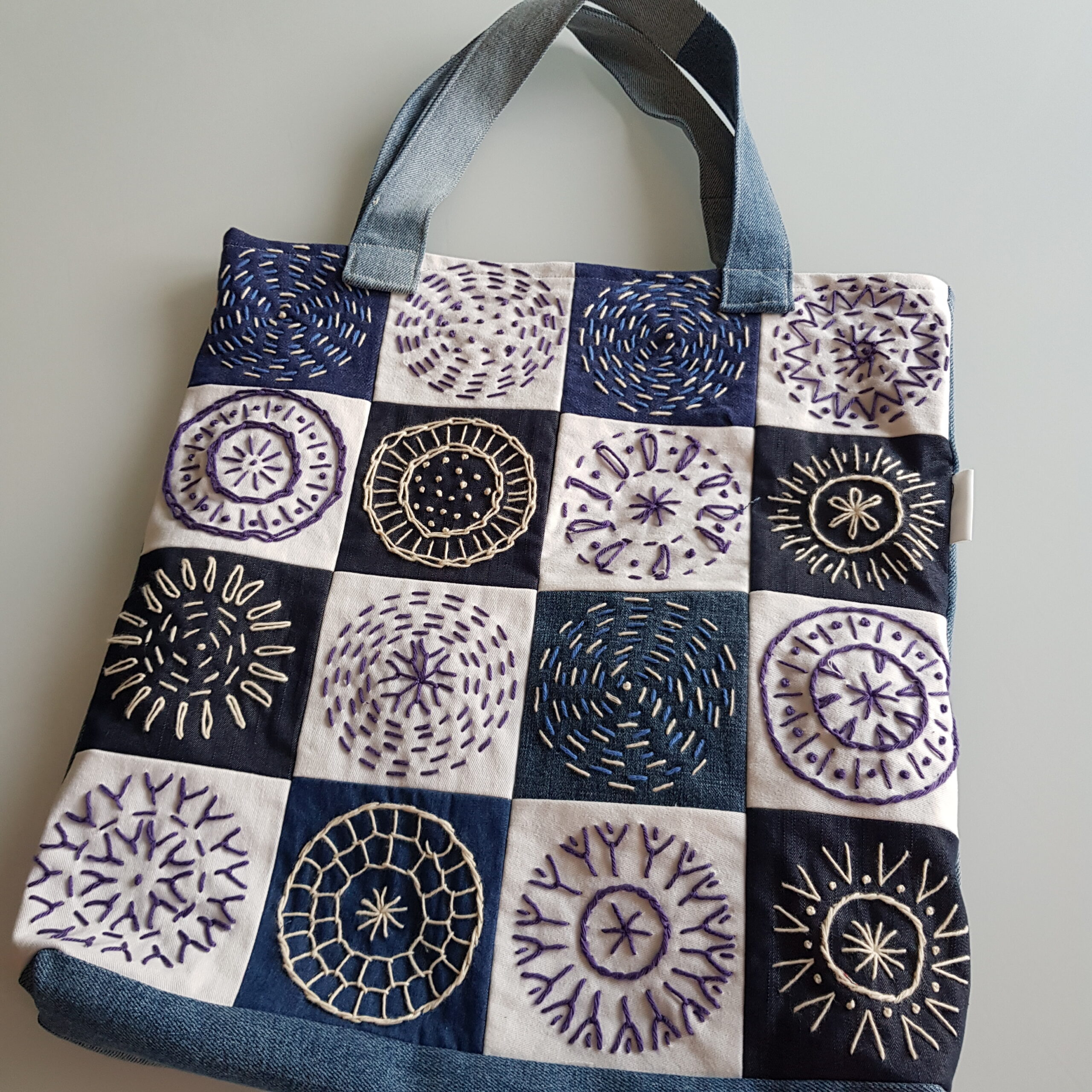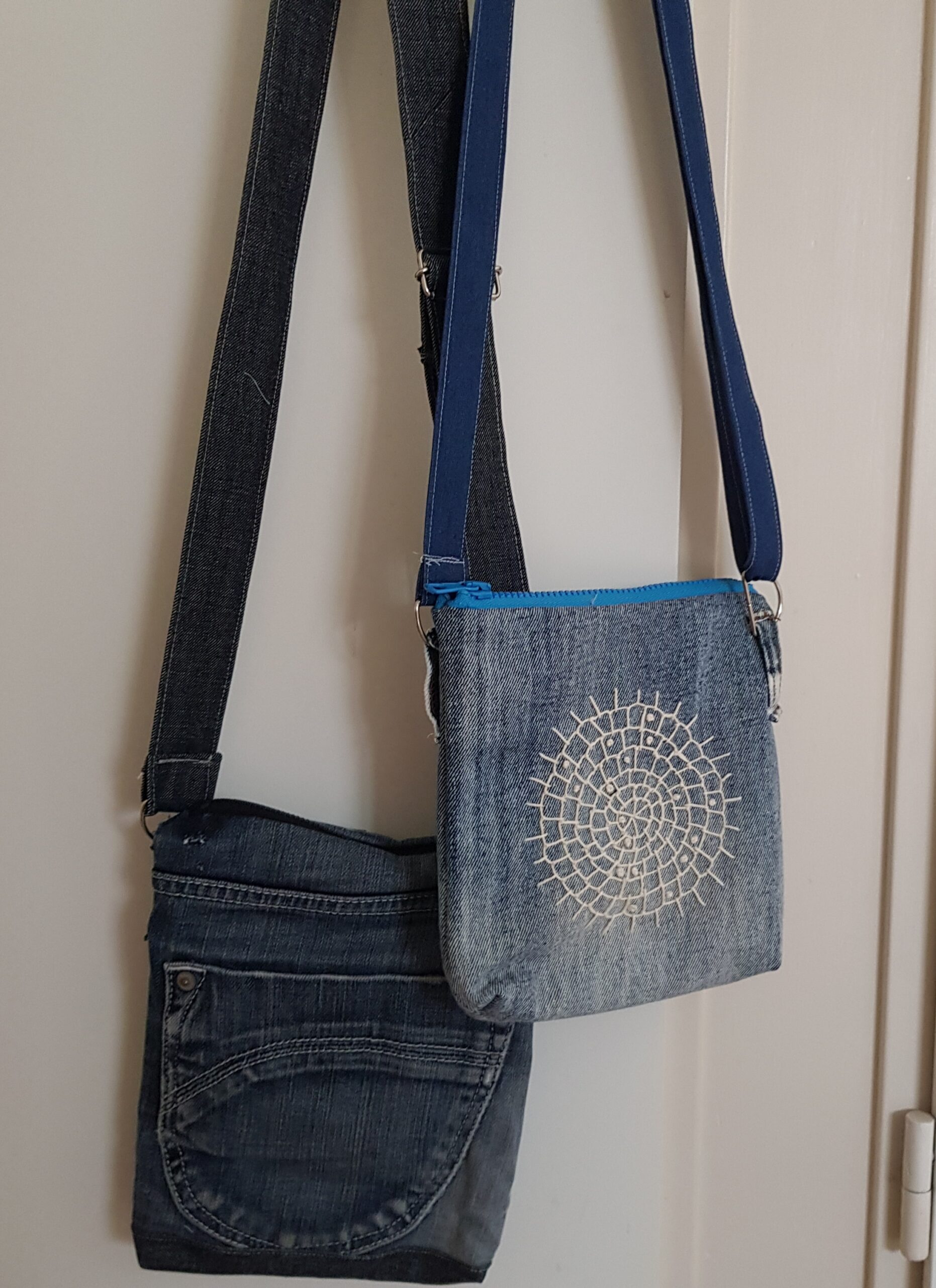Handtasjes gemaakt van oude spijkerbroeken en handgeborduurd.