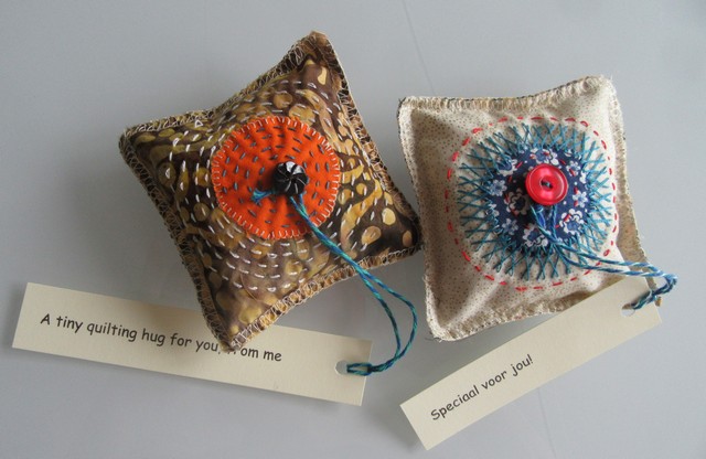 Hug kussentjes. Bedoelt om mensen een hart onder de riem te steken. IN Engeland worden ze gemaakt om eenzame mensen mee op te vrolijken. Maar natuurlijk zijn er veel meer mensen die je hiermee kunt verrassen. Gemaakt van restjes stof die te klein zijn om nog ergens in te verwerken.